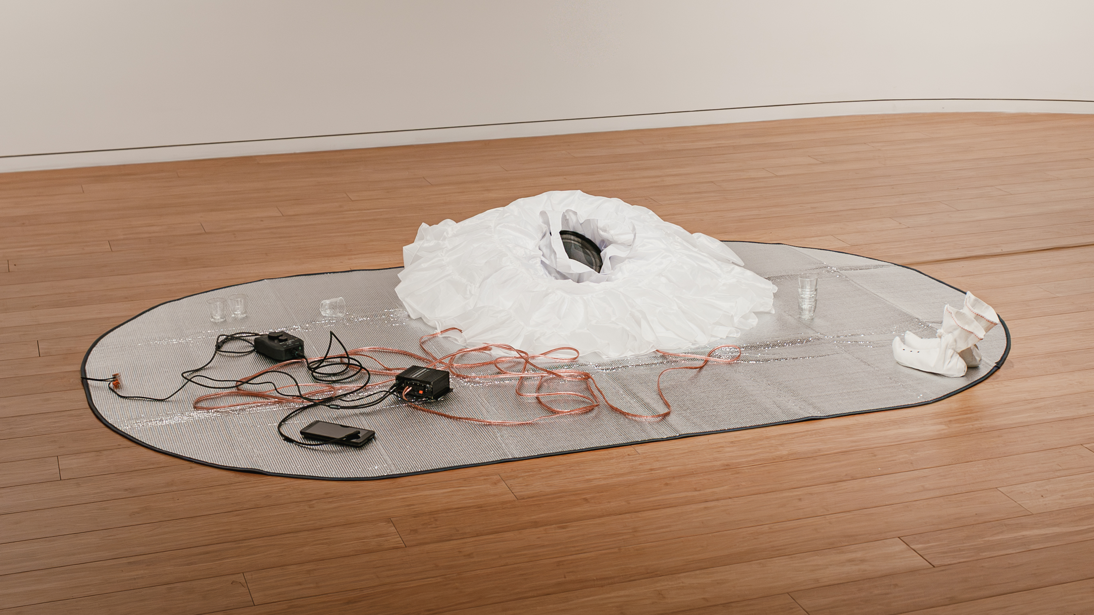 A silver foil mat lies on the floor—the kind spread before graves during memorial visits. A hanbok skirt unfolds in circular formation, surrounded by discarded beoseon and emptied soju glasses. Electronic wires tangle between a smartphone playing the artist’s recorded pansori and an EMF microphone detecting electromagnetic fields from the amplifier and visitors’ phones. Two sounds converge: one is the trace of an absent body, the other a mechanical vocalization that never passed through flesh.