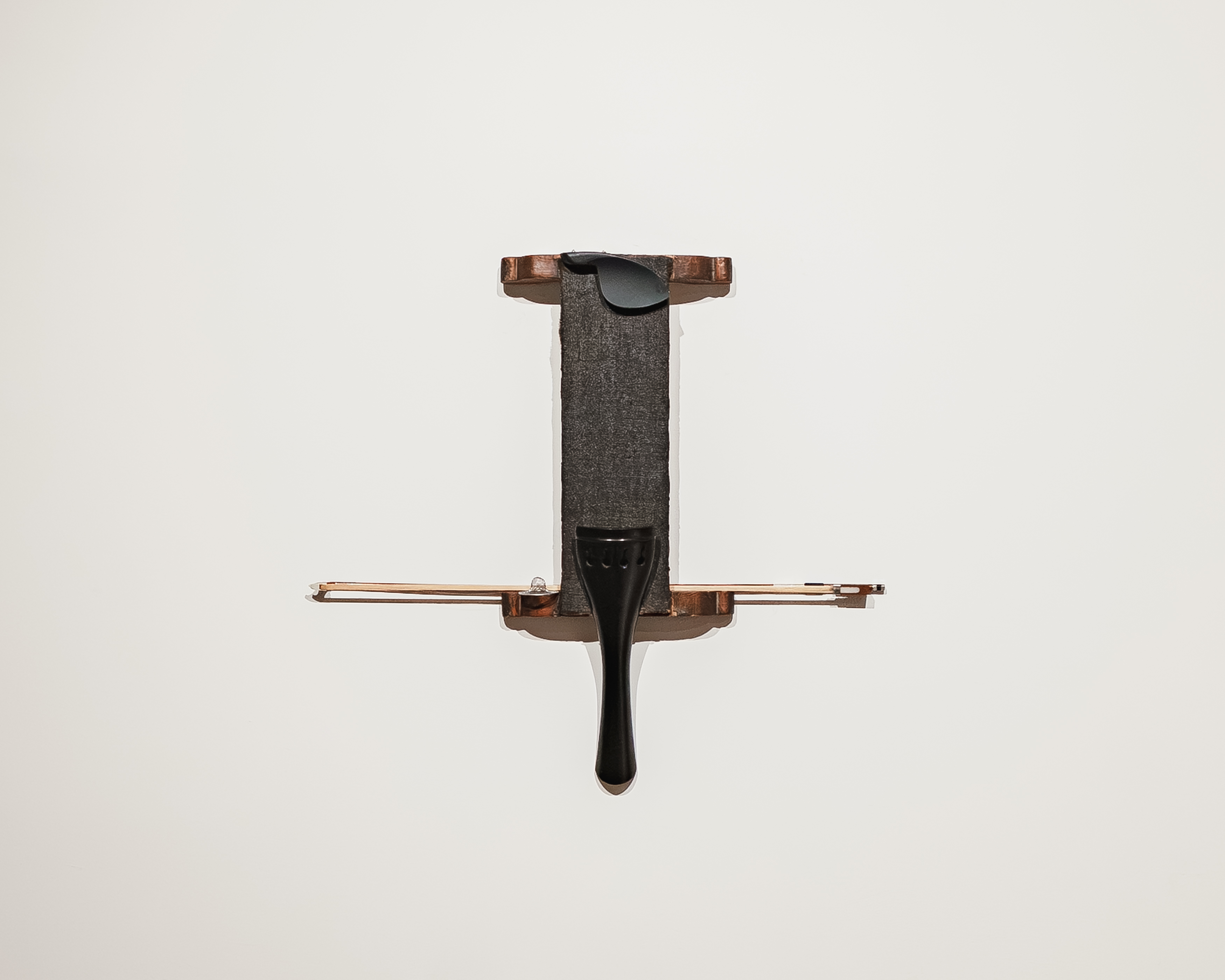 Voice-rest, 2025, Violin chinrest, bow, resin, strainer, hemp with urushi lacquer