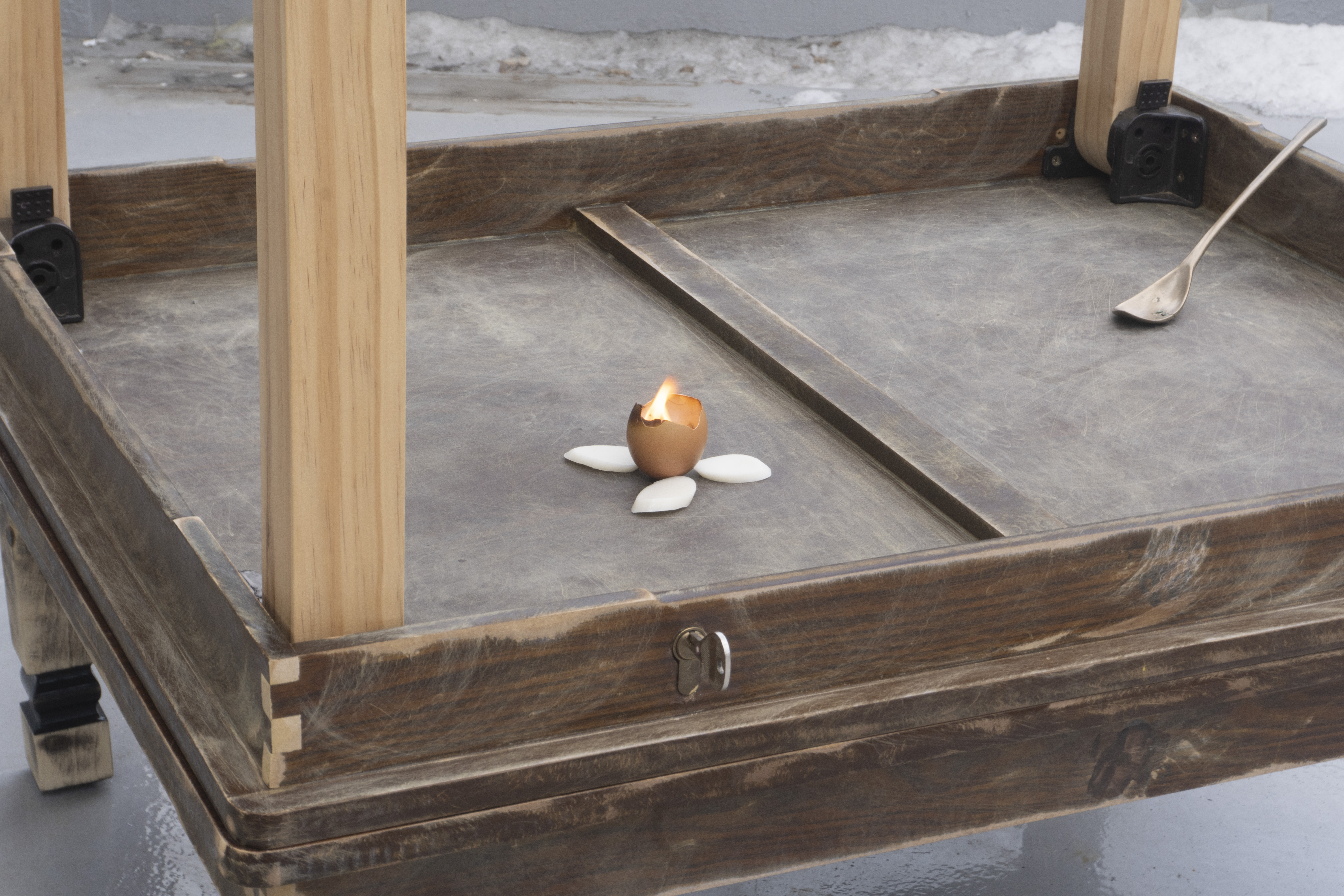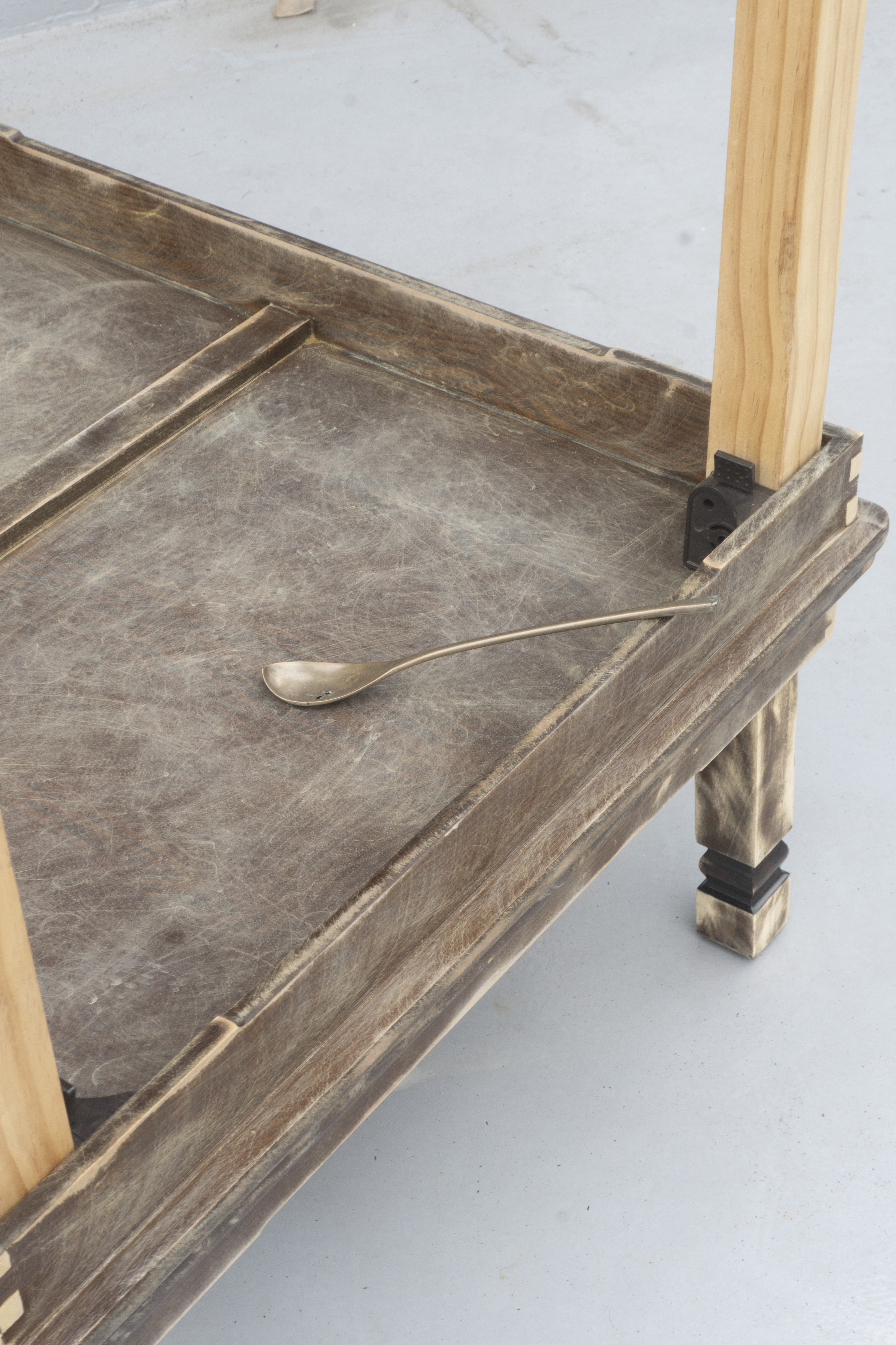 Kay Yoon, Second Stop – Polyphonic Representation, 2024 gyoja table, ritual spoon, key lock and key, 900 x 750 x 2100 mm