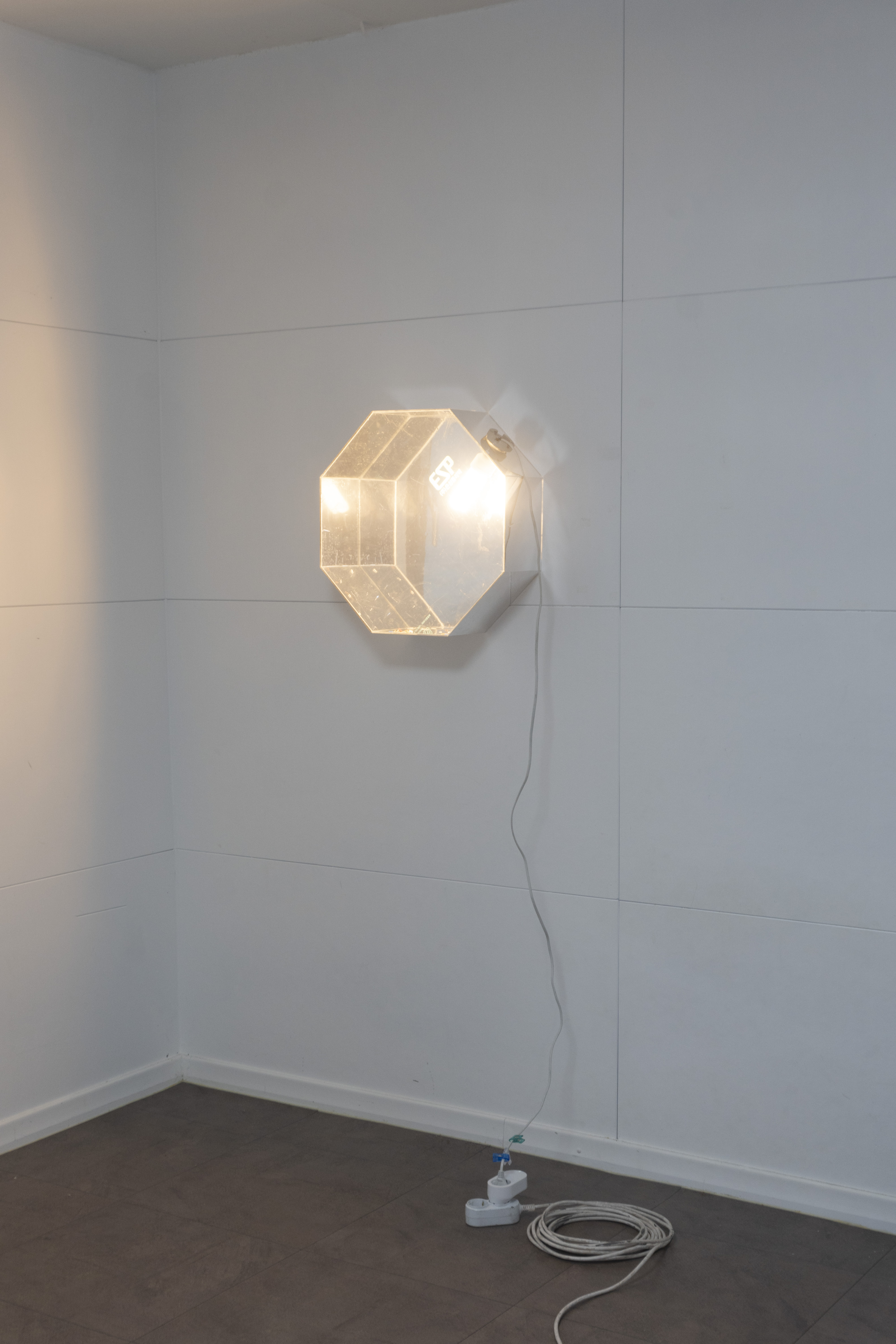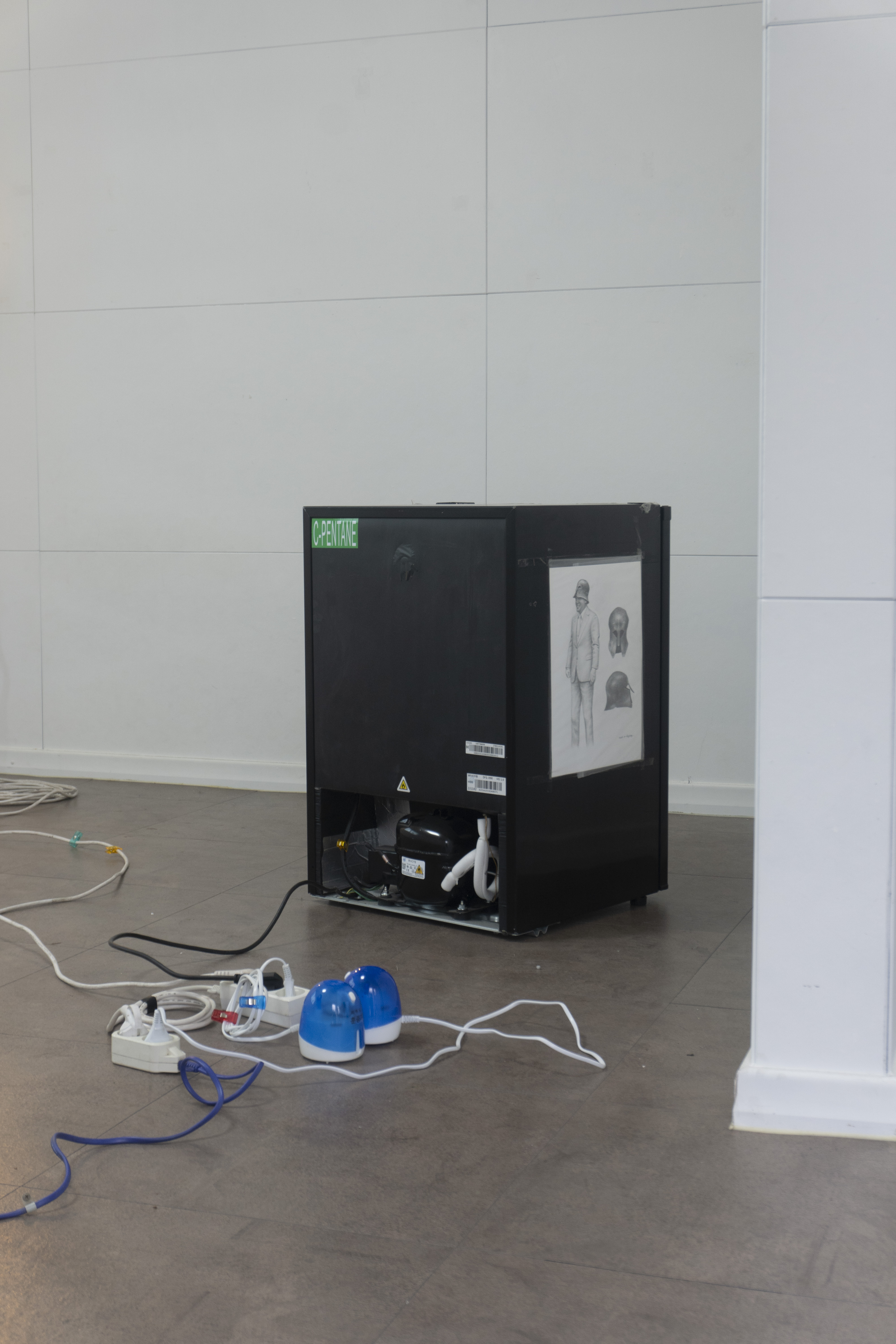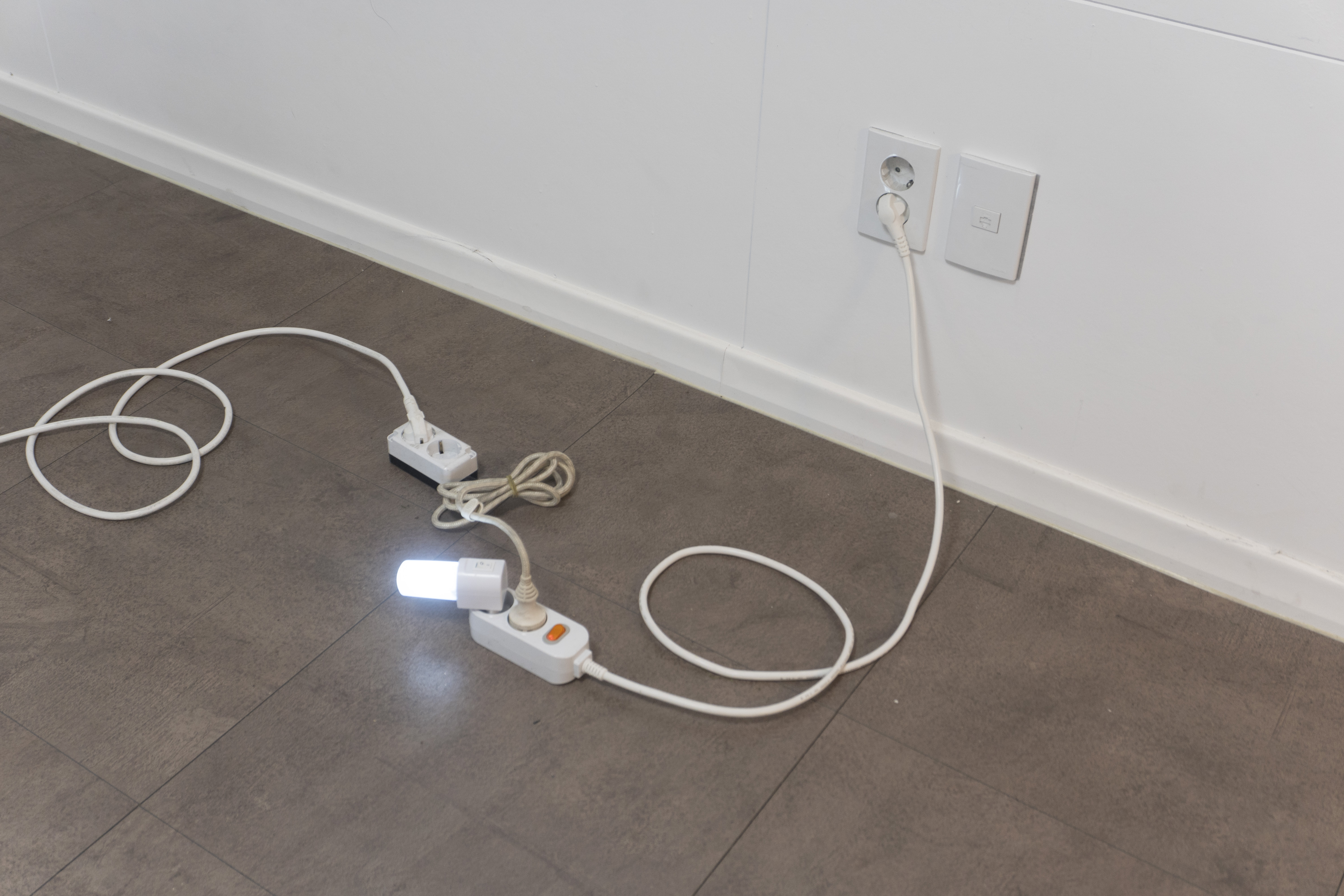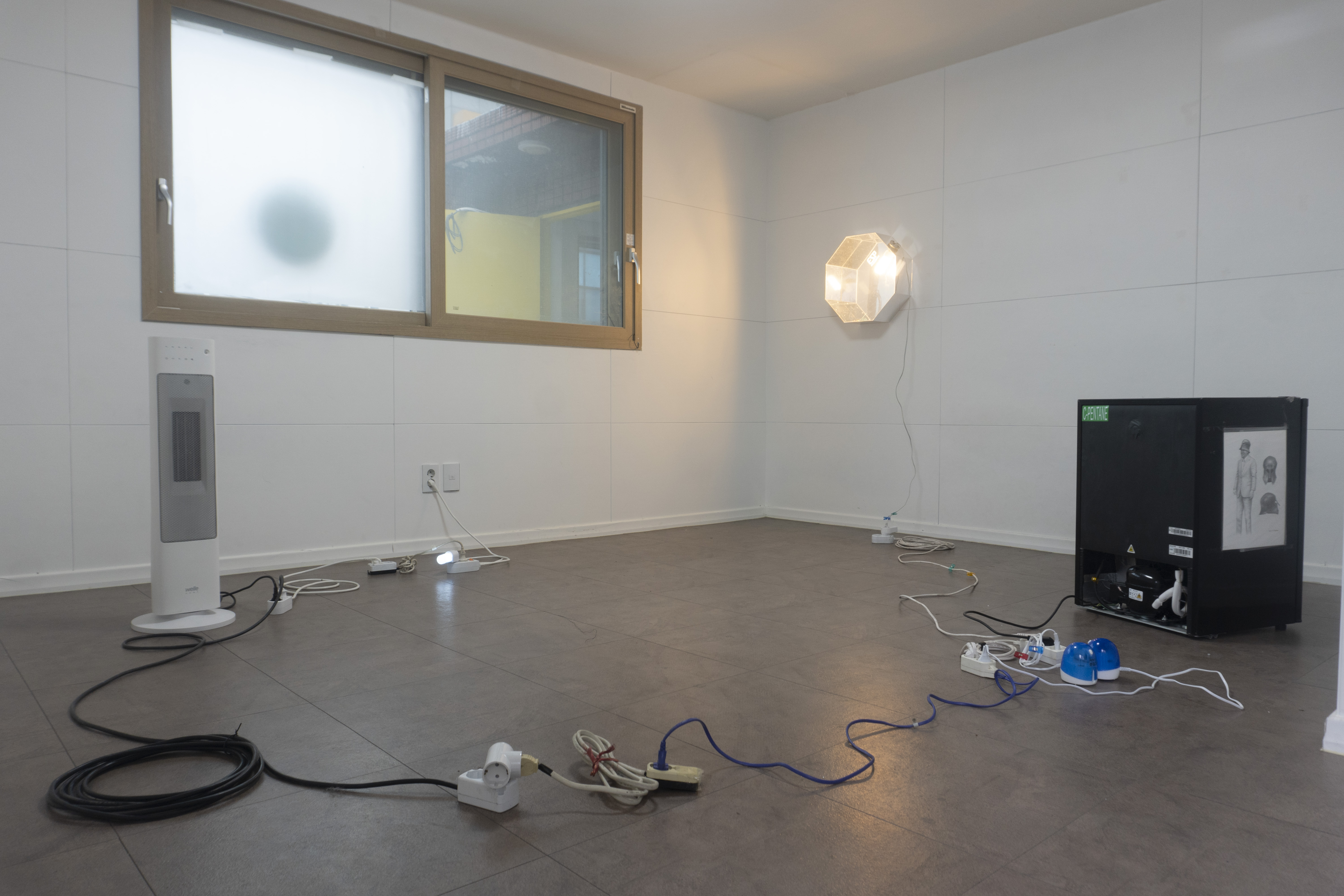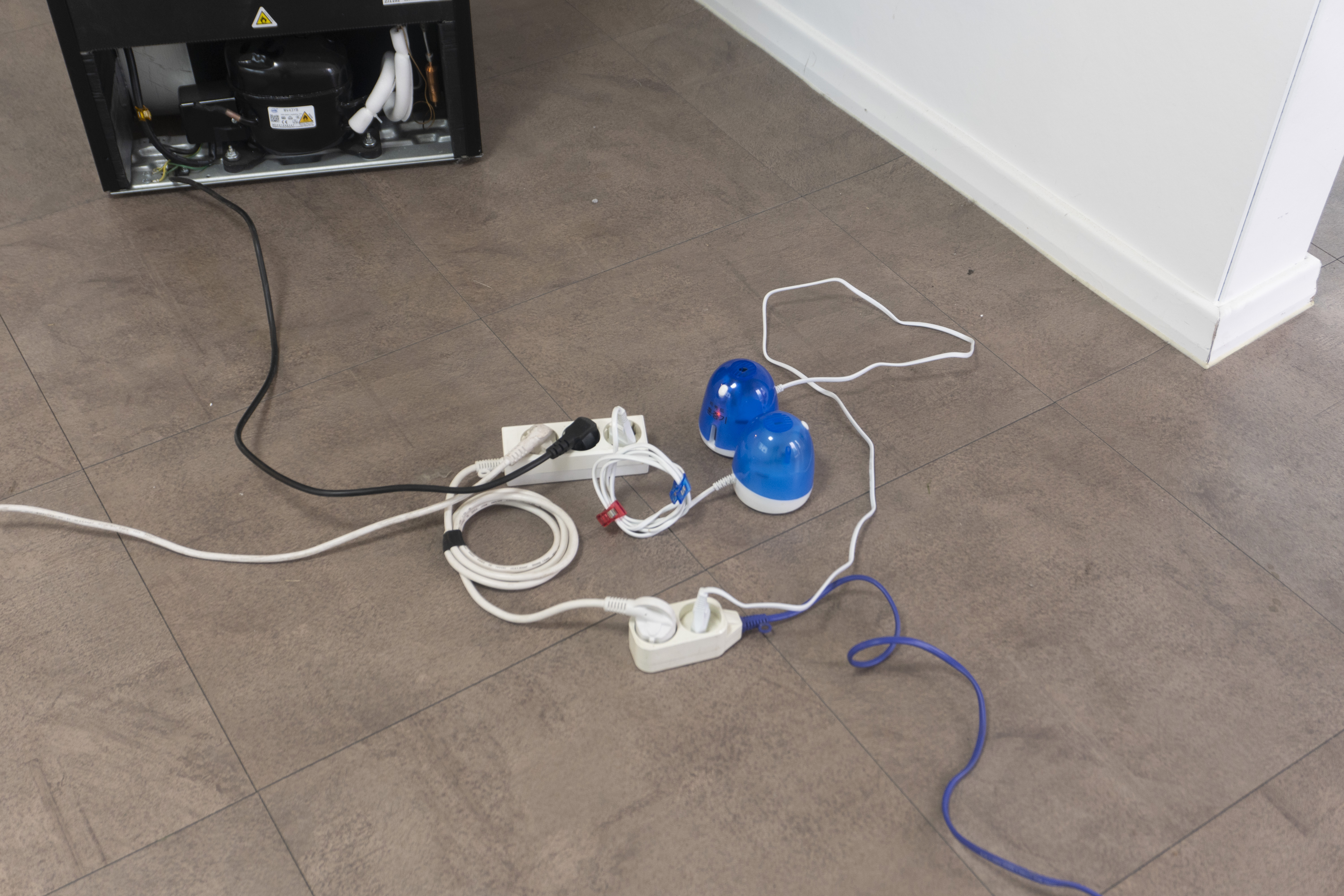 Sebastian Koeck’s <untitled>, 2024, used extension cords, heater, mosquito repellent device, fridge, drawing of Sohn Kee-chung, clips, cable-binder, smart plug, acrylic glass sheets, mirror foil variable dimension