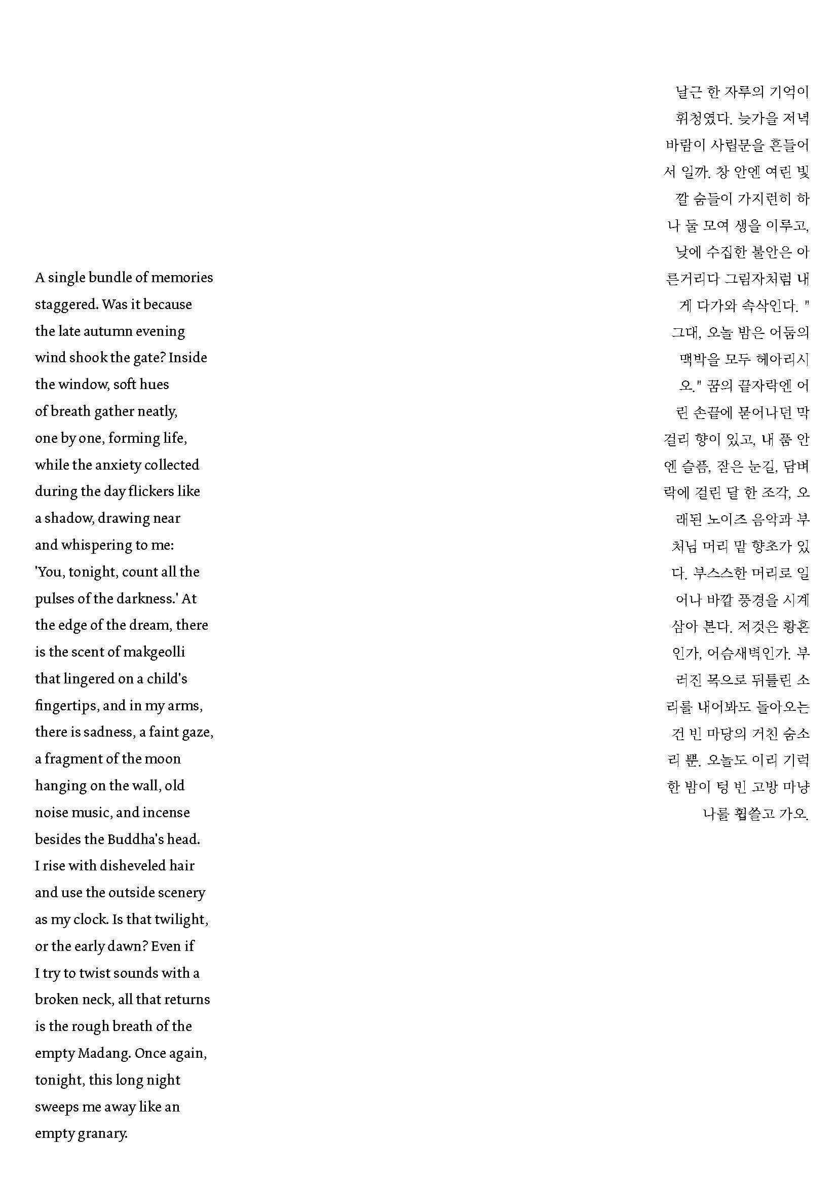 In Korean architecture and cultural practice, "madang" (마당) represents more than just a physical courtyard or open space—it embodies a realm of gathering, transition, and cultural confluence. This single-day exhibition at a Seongsu rooftop brings together works by Kay Yoon and Sebastian Koeck, examining moments of transition while contemplating the poetics of communal space in contemporary urban life.