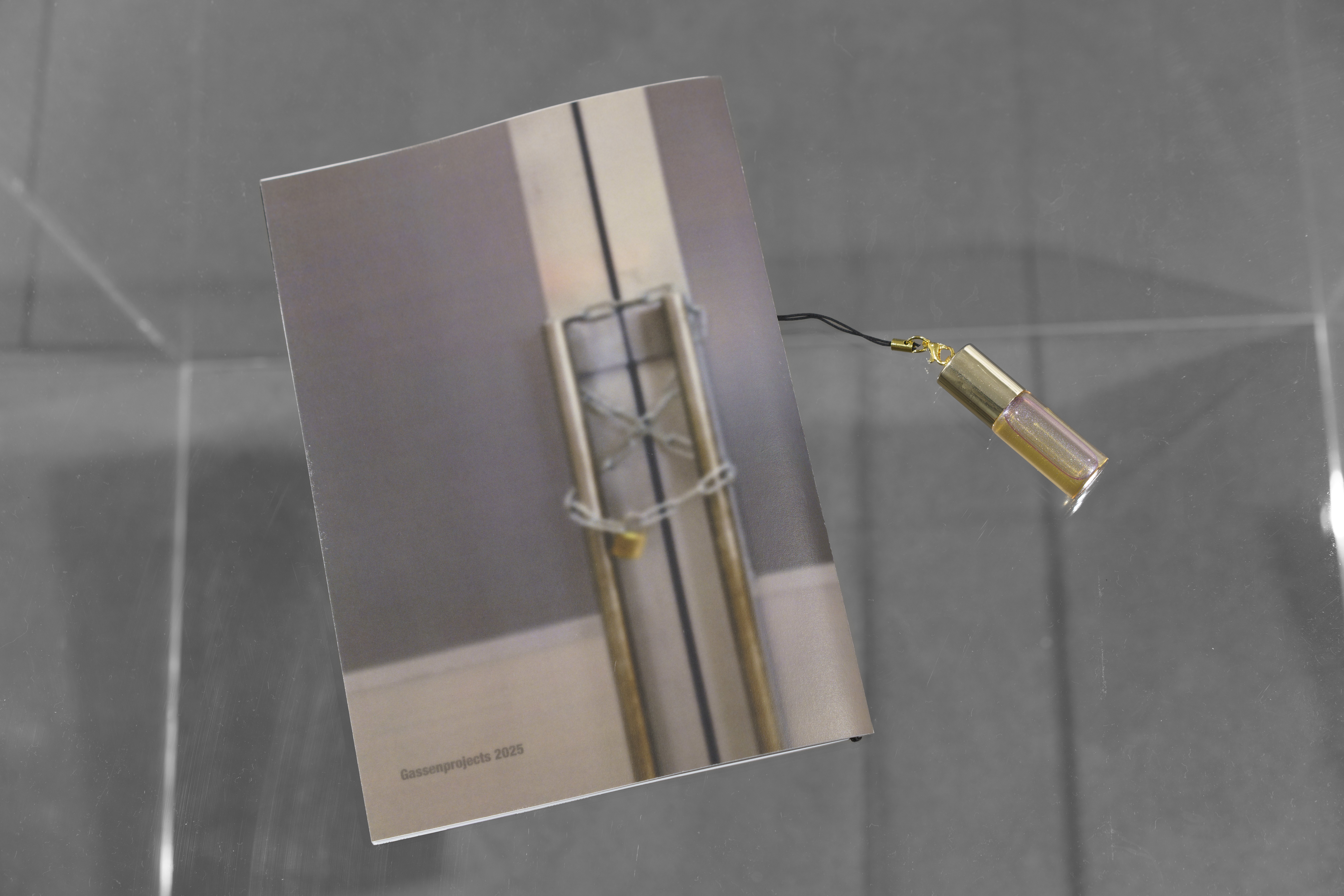 Alongside the exhibition catalogue Gassenprojects composed a fragrance that stands both for the memory of the space and for the collectible—offering an example rather than sample, a metaphor rather than metonymy. The fragrance is inspired by the location of S+U Alexanderplatz where sweet artificial scents that remind us of cheap makeup powder and strawberry milkshake dissipate and leave us with the coldness of wet stone floors, darkened by many shoe soles carrying us to the next destination and leaving a trace of worn off materiality. The multicolored flacon becomes an object added to a personal collection of narration.